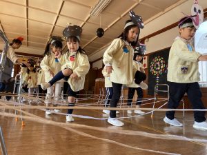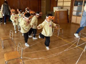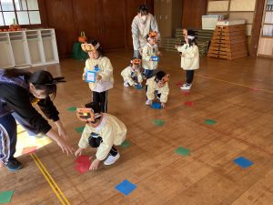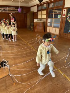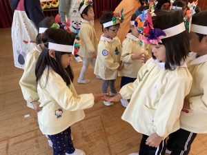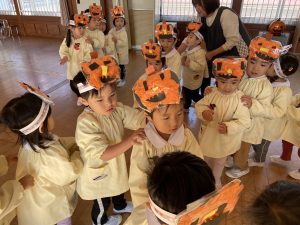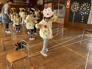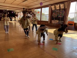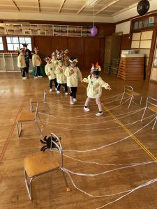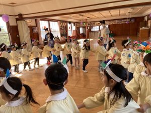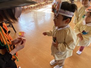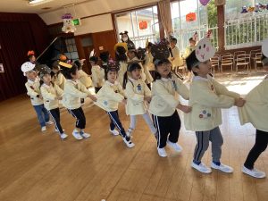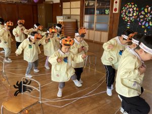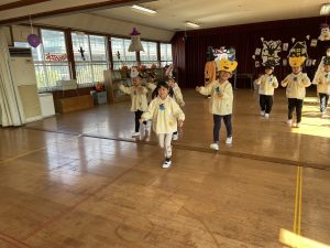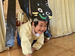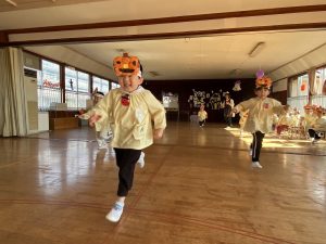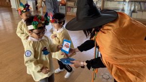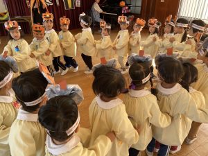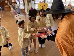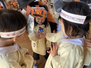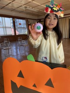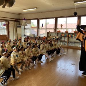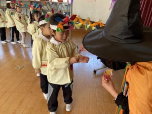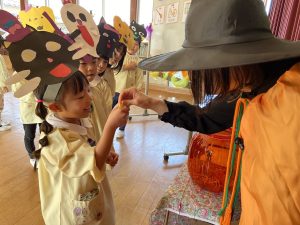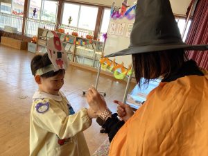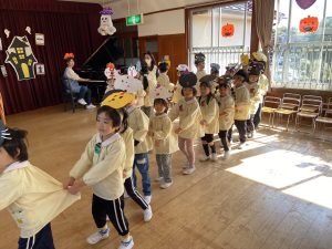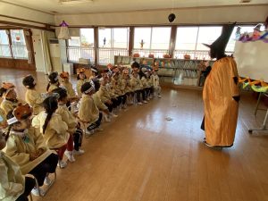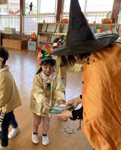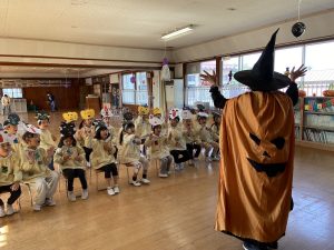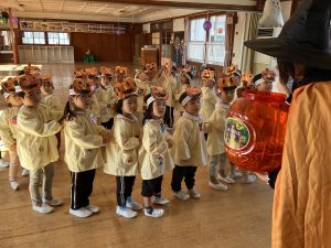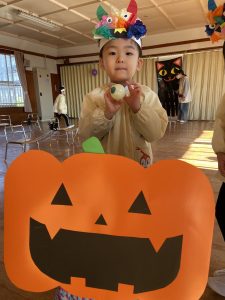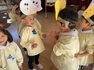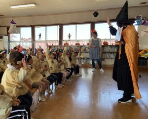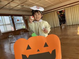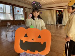 英語の先生ポリーからハロウィンパーティーの招待状が届きました。仮装するおばけのお面を作ったり、英語のジャンケンを覚えたり準備をしながらパーティーの日をとても楽しみにしていました。