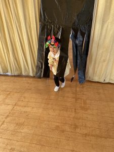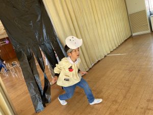 ハロウィンパーティーの日、入り口にはジャック・オー・ランタンがいてレッド、ブルー、グリーンのおばけに色分けしてくれました👻蜘蛛の巣に捕まらないように進み、黒猫のトンネルをくぐるとポリーが待っていました。さぁ、パーティーの始まりです☺