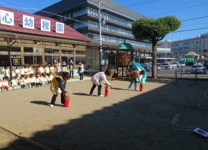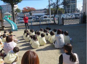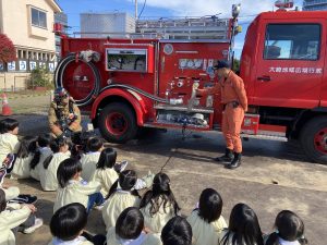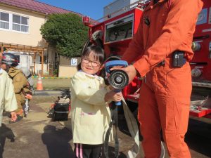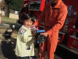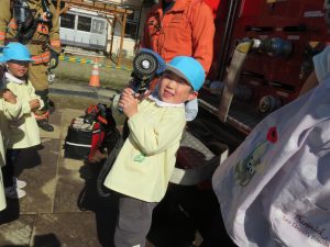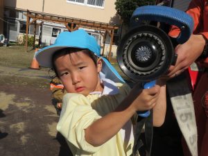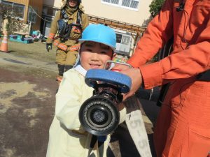 園長先生や消防士さんから、命を守る大事な話を聞きました。そして、「がんばって‼」「やったー、火が消えたよ」など子ども達の元気な応援のもと先生たちの消火訓練もしました。