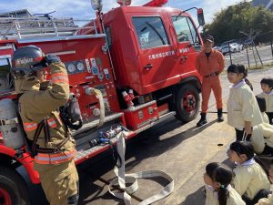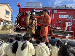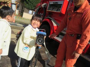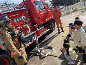 その後の消防車の見学では、火を消す為の道具や消防車の装備などたくさん教えていただきました。子ども達からの様々な質問にも答えてもらいました。