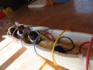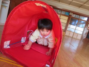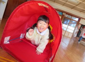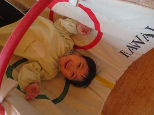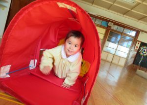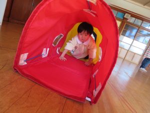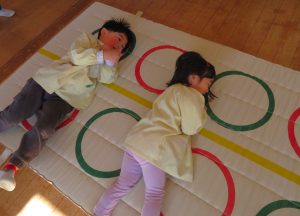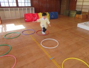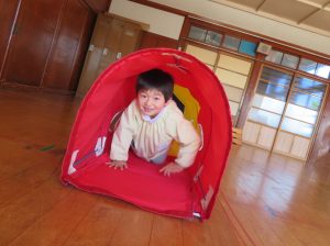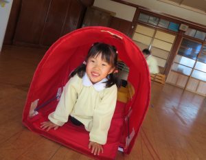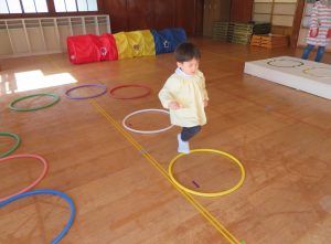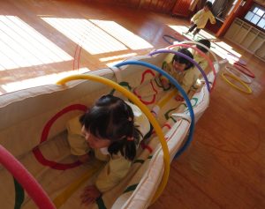 フラフープの輪をジャンプしたり、バランスをとりながらゆらゆらトンネルを進み、マットの上をゴロゴロ転がってまっすぐ進めず大笑いです。