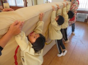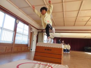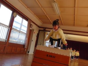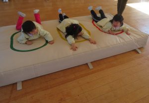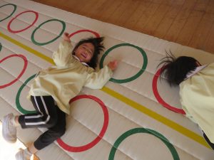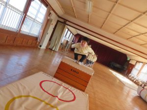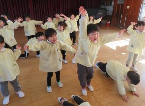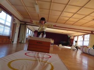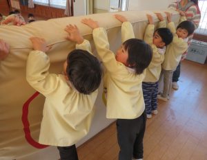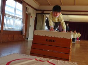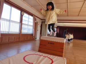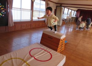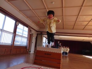 風が冷たい、天気が悪い、外で遊べない・・・😢そんな日々も子ども達は、室内で元気に体を思いっきり動かして遊んでいます。今日は、ホールで友だちと一緒にマットや跳び箱遊びに挑戦です。まずは、しっかり準備体操をします。そして、順番やルールを守る約束をしてからスタートです。