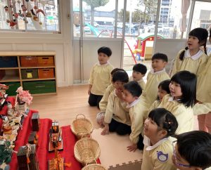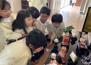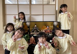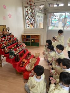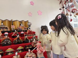 そして、桃の節句の今日は女の子の健やかな成長や幸せを祈って祝う日でもあります。園に飾ったひな人形も「みんなが元気に過ごせますように」と見守っているようです🎎